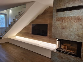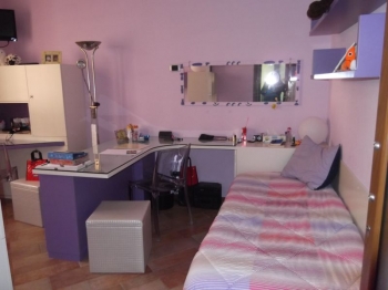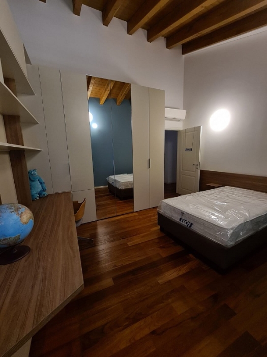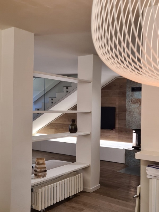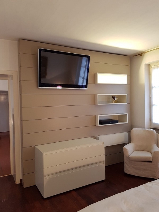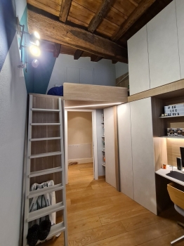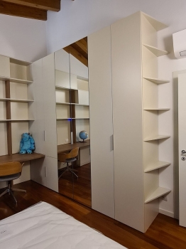 Mobile sottotetto con struttura bilaminato bianco ed ante in mdf laccate bianco opaco. Maniglie finitura cromo satinato