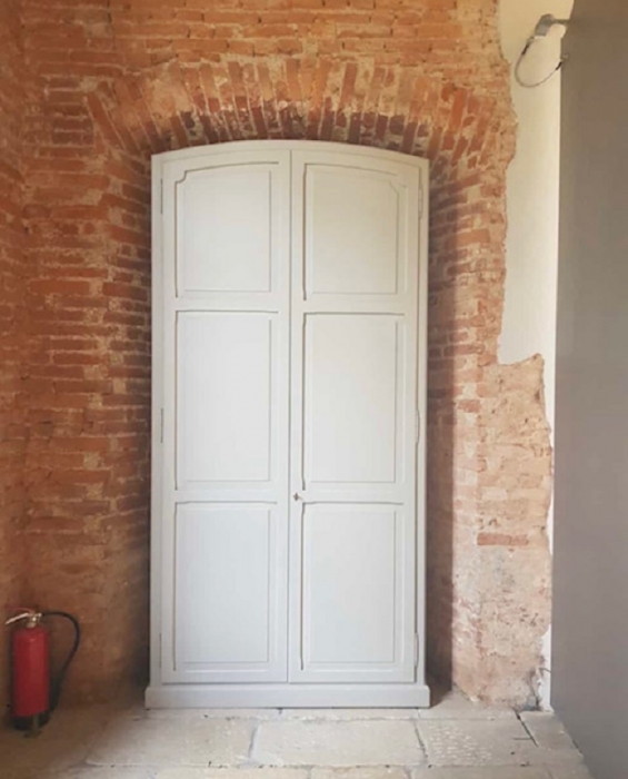 Armadio con struttura in listellare tanganica tinto naturale, ante e fianco a vista in mdf laccato tinta ral con incisione due bugne accessori finitura ottone lucido