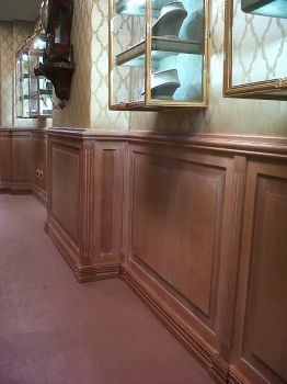 Librerie in noce nazionale verniciato a mano con parte superiore con ripiani a giorno e parte inferiore a 2 ante con listelli verticali sagomati