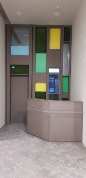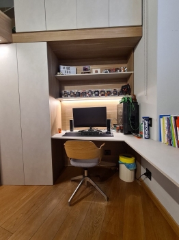 Libreria ad angolo in mdf laccato tinta ral con ripiani a giorno superiori ed ante in mdf laccato ral con incisione 1 bugna parte inferiore