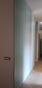 Mobile con struttura in listellare tanganica verniciato, ante in mdf laccato opaco con incisione doghe verticali maniglie ottone lucido