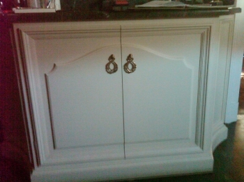 Mobile in rovere massello verniciato e tinto con 4 ante inferiori con bugnatura. 4 cassetti centrali e piattaia parte superiore. Accessori bronzo antico