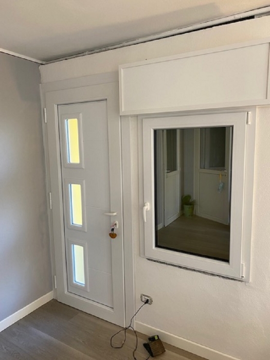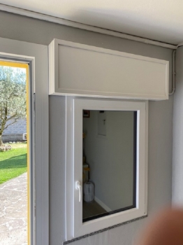 Finestra in pino lamellare verniciato naturale completa di monoblocco tapparella e cassone.