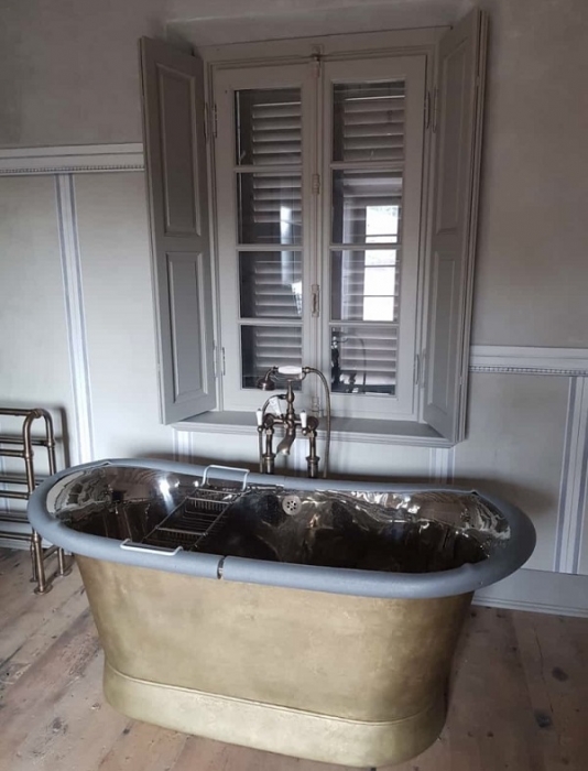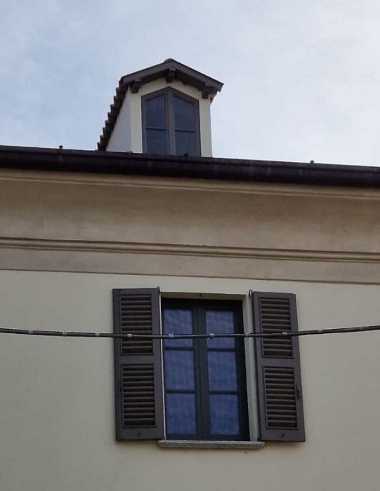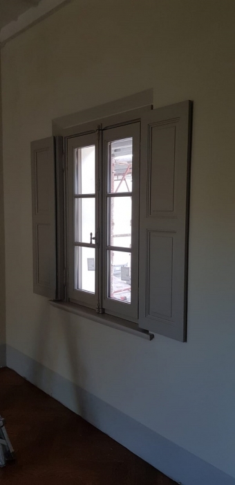 Finestra in pino lamellare verniciato finitura decapè fuseruoli tipo lombardo maniglia ottone lucido e ante d'oscuro interno restaurate