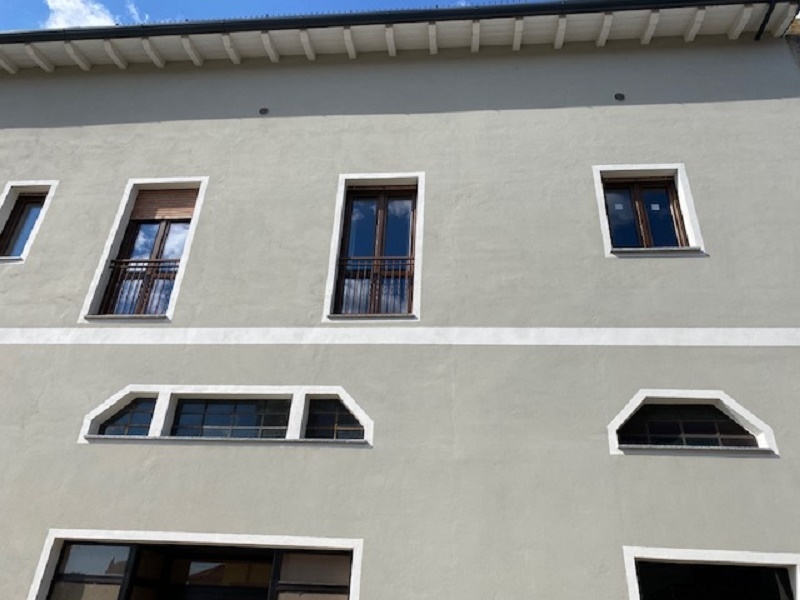 finestre mod. Top 68/06 in pino lamellare laccato tinta Ral con fuseruoli tipo Lombardo, griglie pino lamellare mm. 45 centro storico laccate tinta ral a murare con accessori finitura nero