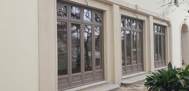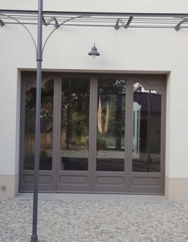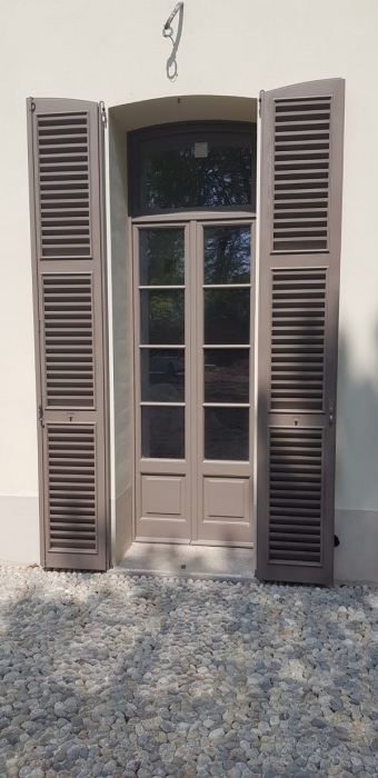 Porta finestra in pino lamellare verniciato tinta ral con due ante battenti, vetro isolante di sicurezza, sopraluce fisso ad arco, persiana esterna tipo centro storico in Iroko lamellare verniciato tinta ral a due battenti con cardini a murare