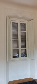 Finestra in pino lamellare verniciato finitura decapè con foderina inferiore bugnata, fuseruoli tipo lombardo maniglia ottone lucido e ante d'oscuro interno restaurate