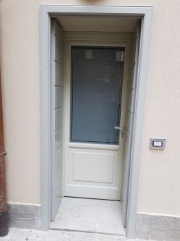 Serramenti tipo monoblocco con antone dogato bi-facciale in abete impregnato ral 3003 con ferramenta finitura nero