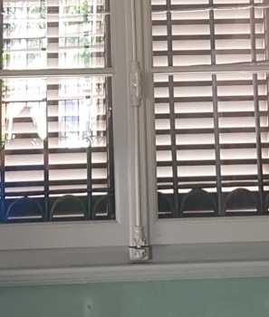 Persiana in pino lamellare laccato tita ral opaca con stecca tipo Lombardo e ferramenta applicata finitura nero opaco. Ferma griglia a saltarello tipo vecchio
