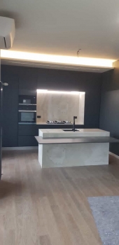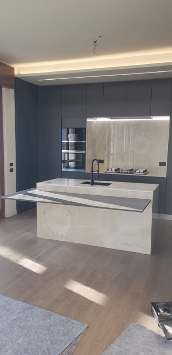 Mobili cucina finitura laccata bianco lucido spazzolato con top marmo nero ardesia, elettrodomestici inox e maniglie cromo satinato