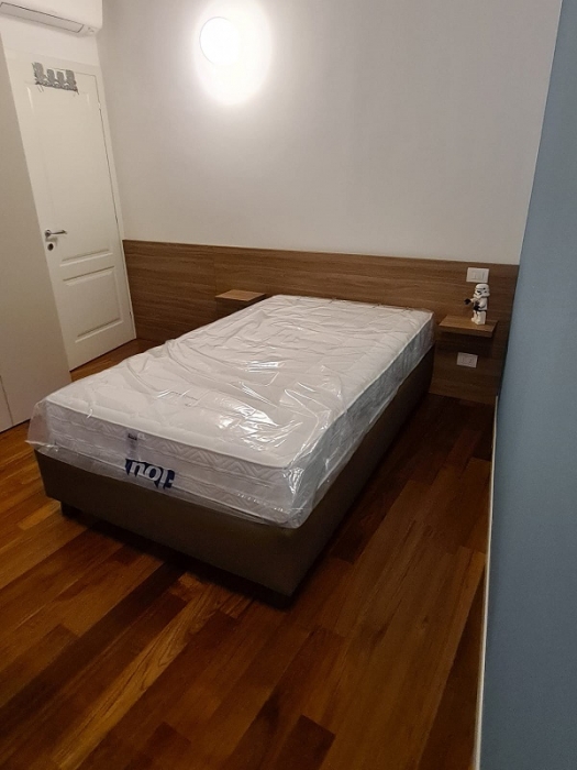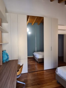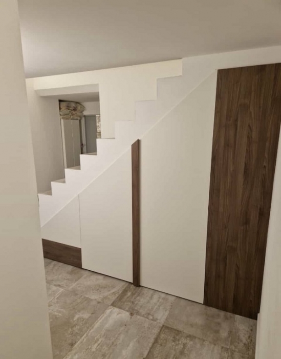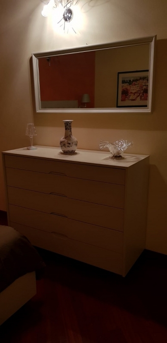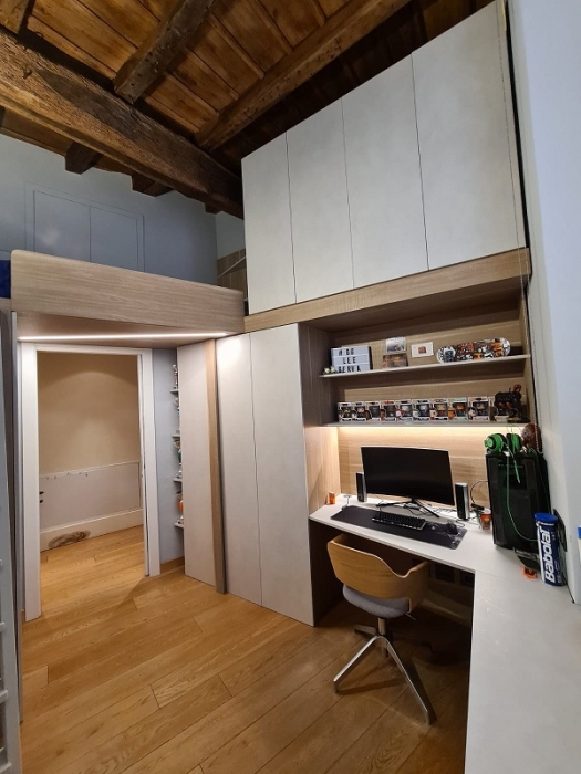 Mobile sottotetto con struttura bilaminato bianco ed ante in mdf laccate bianco opaco. Maniglie finitura cromo satinato