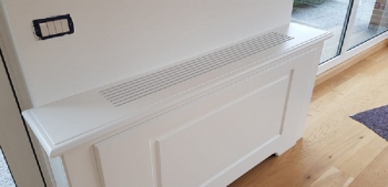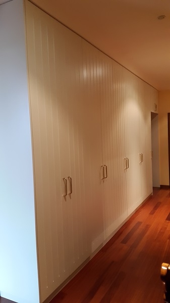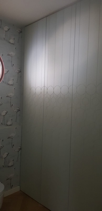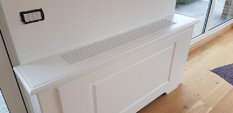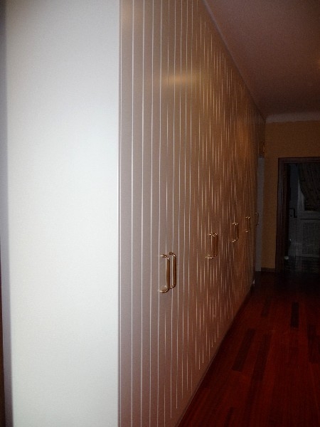 Mobile con struttura in listellare tanganica verniciato, ante in mdf laccato opaco con incisione doghe verticali maniglie ottone lucido