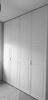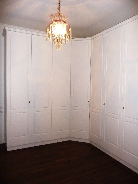 Armadio con struttura in listellare tanganica tinto naturale, ante e fianco a vista in mdf laccato tinta ral con incisione due bugne accessori finitura ottone lucido