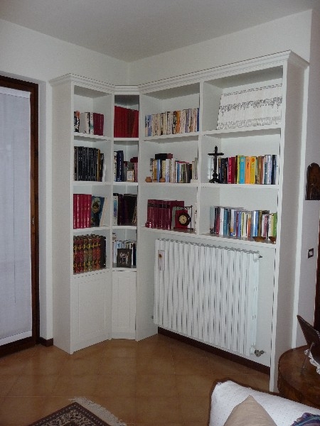 Libreria ad angolo in mdf laccato tinta ral con ripiani a giorno superiori ed ante in mdf laccato ral con incisione 1 bugna parte inferiore