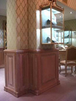 Librerie in noce nazionale verniciato a mano con parte superiore con ripiani a giorno e parte inferiore a 2 ante con listelli verticali sagomati