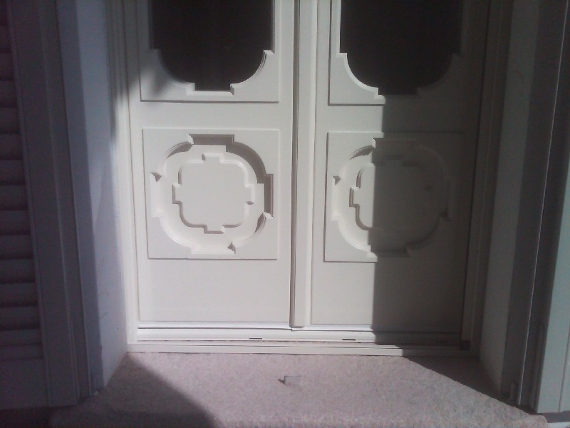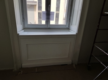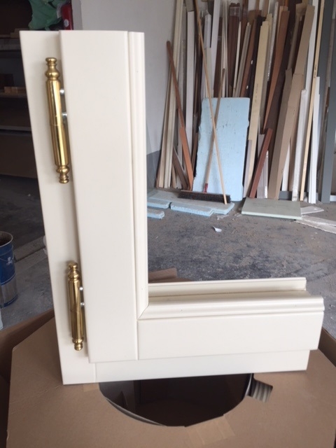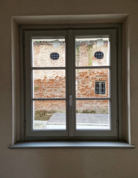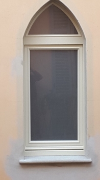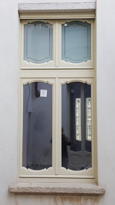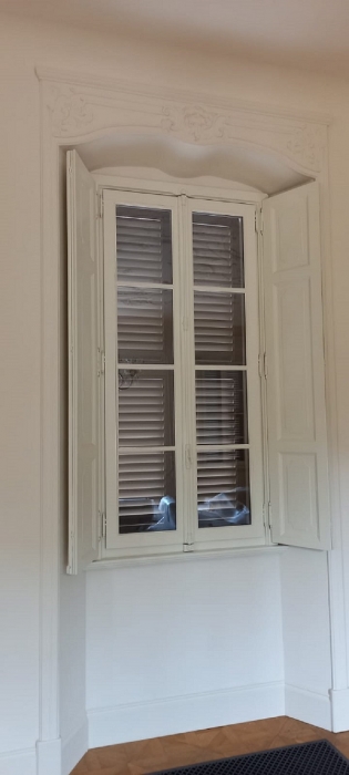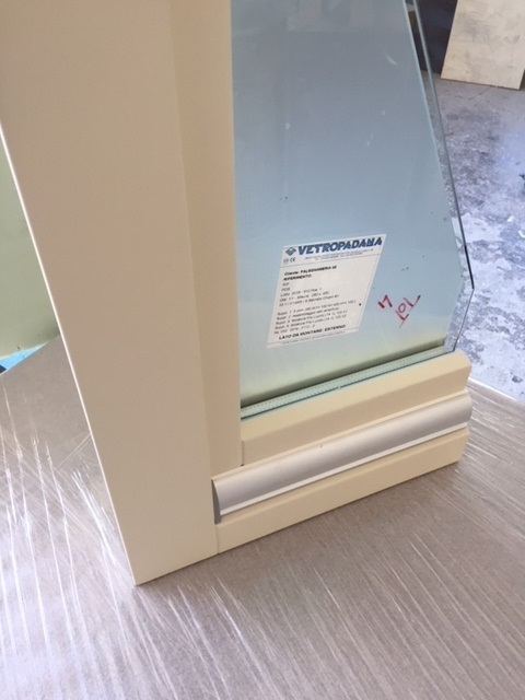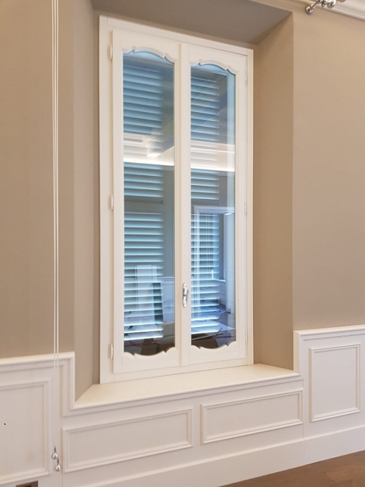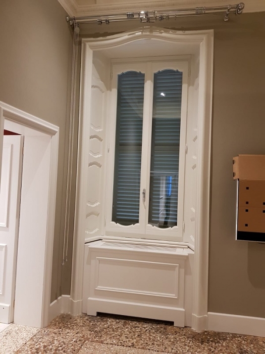 Finestra in larice lamellare mm. 68 laccato ral 1013 con sagome barocco, imbotti sagomate sottoluce cieco davanzale e contro telaio con cornici barocco maniglia ottone naturale