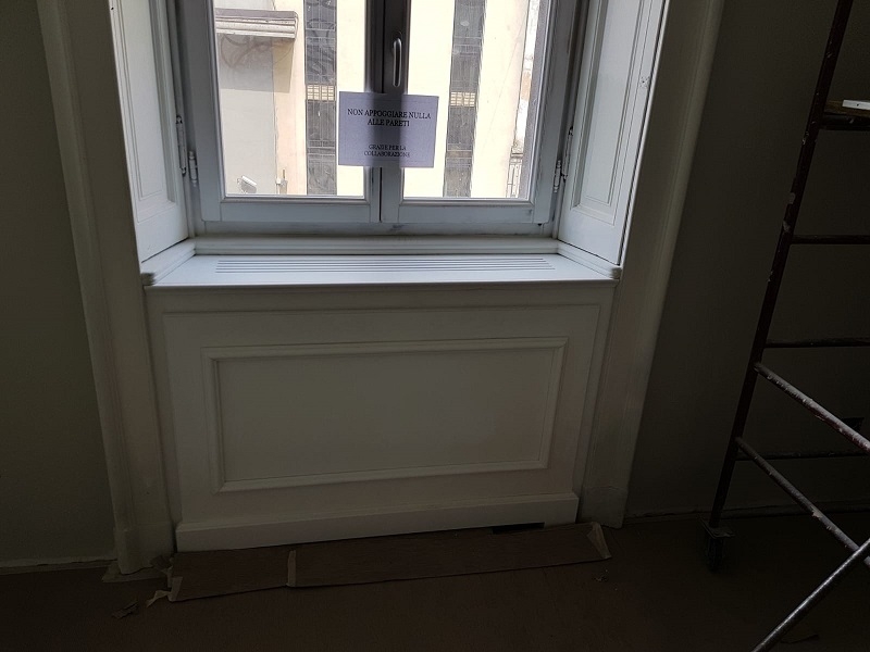 Griglie in pino lamellare mm. 45 Centro storico laccate tinta ral a murare con accessori finitura nero