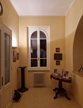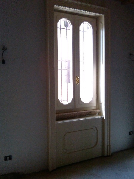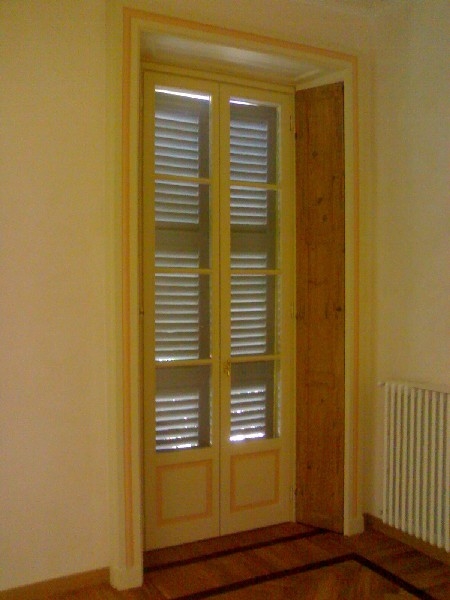Finestra in pino lamellare verniciato finitura decapè fuseruoli tipo lombardo maniglia ottone lucido e ante d'oscuro interno restaurate