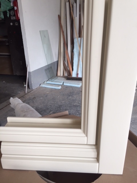 Finestra in larice lamellare mm. 68 laccato ral 1013 con sagome barocco, imbotti sagomate e contro telaio con cornici barocco maniglia ottone naturale