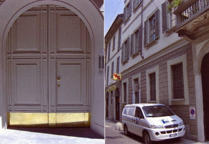 Portone carraio in larice laccato ral con bugnature sagomate, zoccolatura ottone e portina pedonale con apertura elettrica