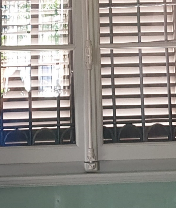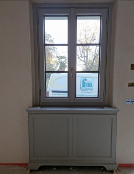 Finestra in pino lamellare verniciato finitura decapè con foderina inferiore bugnata, fuseruoli tipo lombardo maniglia ottone lucido e ante d'oscuro interno restaurate