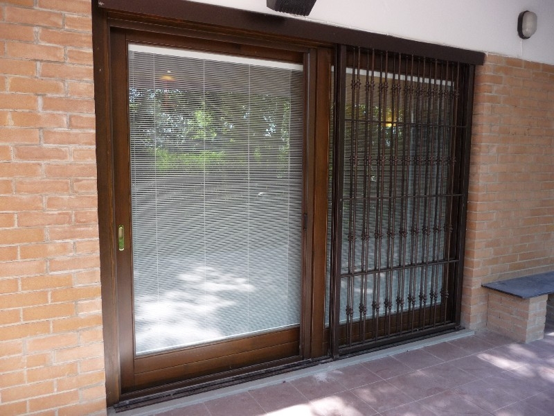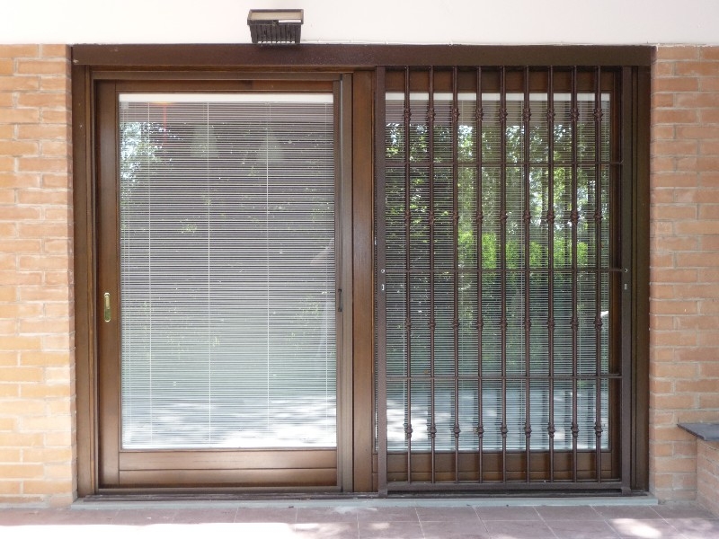 Porta finestra alzante scorrevole ( 1 anta fissa 1 anta scorrevole) in pino lamellare tinto noce completa di vetro isolante a camera con veneziana interna a funzionamento magnete/corda