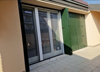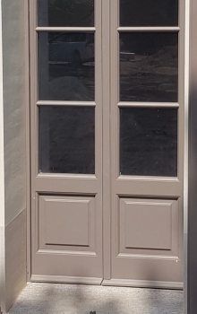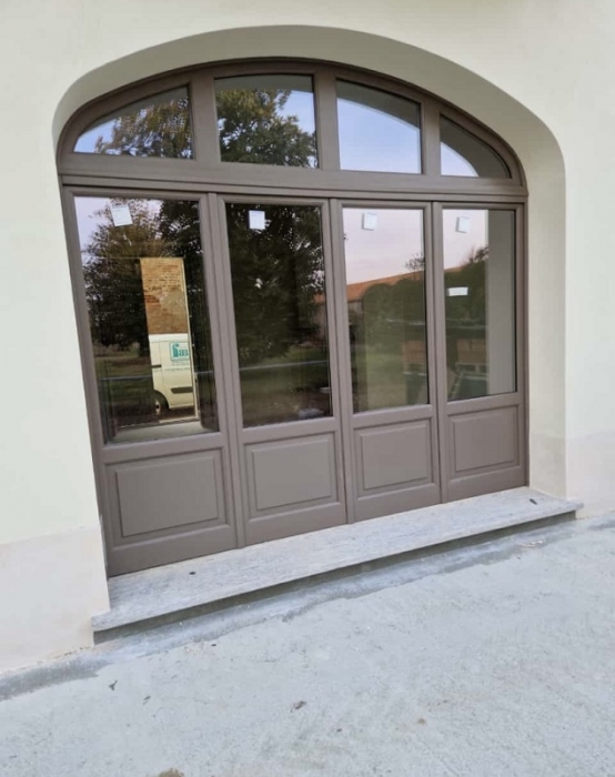 Porta finestra in pino lamellare verniciato tinta ral con due ante battenti, vetro isolante di sicurezza, sopraluce fisso ad arco, persiana esterna tipo centro storico in Iroko lamellare verniciato tinta ral a due battenti con cardini a murare