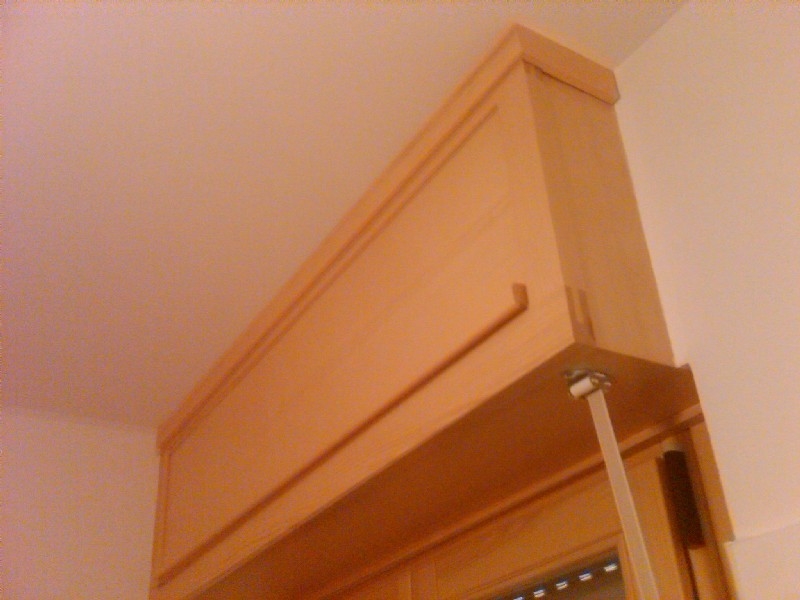 Particolare cassonetto per tapparella in pino verniciato naturale con sportello frontale.