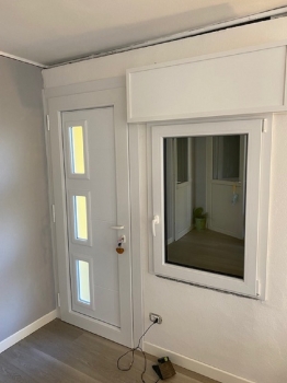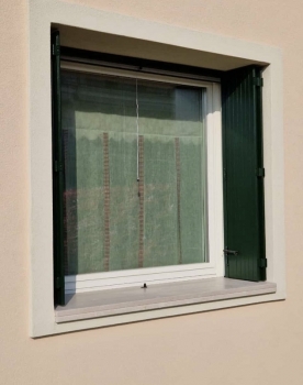 Serramenti mod. Top 68/06 in pino lamellare verniciato tinta ral 1013 zanzariera alluminio incasso totale verniciata ral 1013