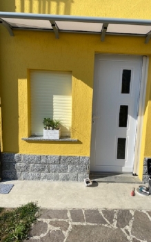 Serramenti tipo monoblocco con antone dogato bi-facciale in abete impregnato ral 3003 con ferramenta finitura nero