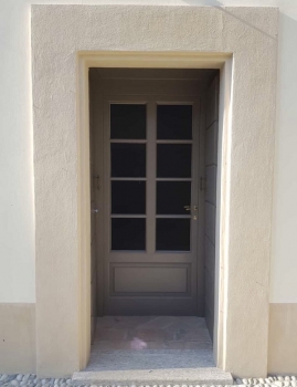 Porta finestra in pino lamellare laccato tinta ral con parte centrale ad anta con tre bugne, parti laterali fisse con vetro di sicurezza satinato e sopraluce fisso ad arco